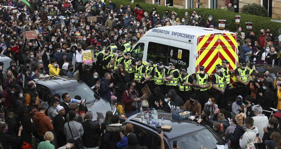 Στις 12 Μαΐου τα ξημερώματα, η Βρετανική Υπηρεσία Μετανάστευσης συνέλαβε στη Γλασκόβη δύο πρόσφυγες εκτελώντας εντολή απέλασης. Γρήγορα 200 κάτοικοι μαζεύτηκαν και απέκλεισαν το φορτηγάκι της υπηρεσίας, τραγουδώντας «Είναι γείτονές μας, αφήστε τους να φύγουν». Μια γυναίκα ξάπλωσε μπροστά στις ρόδες για να το σταματήσει. Μετά από αρκετές ώρες παρενέβη η αστυνομία και απελευθέρωσε τους δύο μετανάστες.